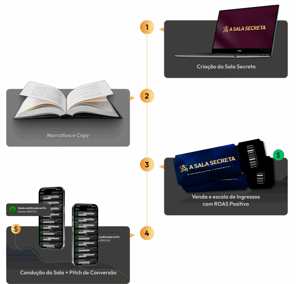 É sobre usar a Sala Secreta como ferramenta para faturar múltiplos 6 e 7 dígitos por mês, com um modelo leve, validado e lucrativo desde o primeiro anúncio.