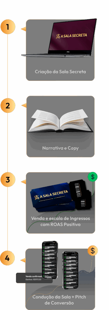 A Sala Secreta é um evento fechado no Zoom, 100% focado em ensinar, passo a passo, como construir, estruturar e escalar um lançamento pago com lucro e previsibilidade desde o primeiro anúncio.